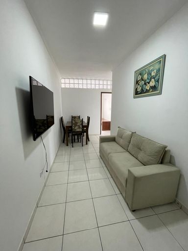 O apartamento possui 2 dormitórios, sala confortável, cozinha americana que integra os espaços de forma moderna, além de área de serviço e banheiro social com box em blindex, garantindo funcionalidade e praticidade.