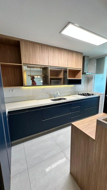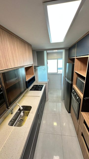 A cozinha americana é moderna e funcional, equipada com móveis planejados que proporcionam praticidade no dia a dia. A área de serviço também possui armário, facilitando a organização, além de um lavabo que atende perfeitamente às visitas. O imóvel dispõe ainda de 2 vagas de garagem, oferecendo mais segurança e conforto.