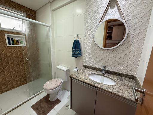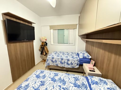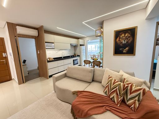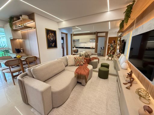O imóvel conta com 3 dormitórios, sendo 2 suítes espaçosas, além de uma sala ampla e aconchegante, perfeita para receber familiares e amigos. A cozinha americana com armários planejados integra praticidade e elegância, conectando-se harmoniosamente à área de serviço. O apartamento ainda dispõe de 1 banheiro social com box blindex, garantindo conforto para todos os ambientes.