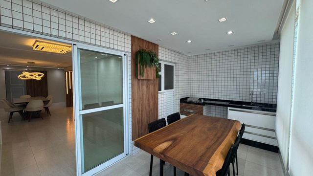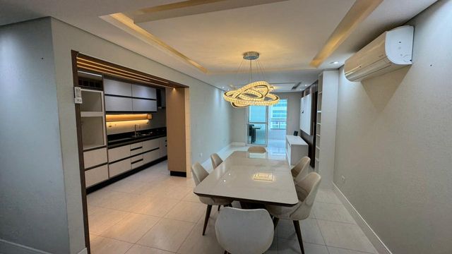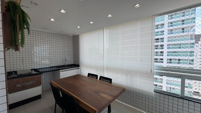 A área social conta com uma sala ampla integrada à sacada gourmet envidraçada com vista para o mar, um espaço perfeito para relaxar, receber amigos e aproveitar momentos especiais com uma bela paisagem. A cozinha possui armários planejados, garantindo organização e funcionalidade no dia a dia, além de contar com área de serviço independente.