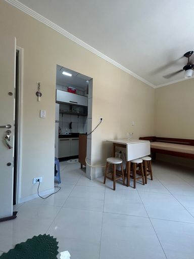 O imóvel conta com 22 m² de área útil, distribuídos de forma funcional, oferecendo 1 dormitório amplo, cozinha espaçosa com armários e banheiro social com box em vidro blindex. Localizado no 1º andar, com acesso por escada, o apartamento é bem ventilado e iluminado.