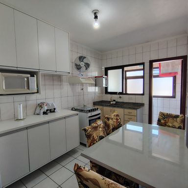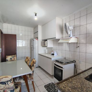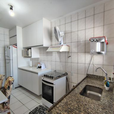 A cozinha é ampla e conta com armários planejados, oferecendo praticidade no dia a dia. Integrada à área de serviço, facilita a rotina com organização e funcionalidade. Além da suíte, o apartamento dispõe de 1 banheiro social com box em vidro blindex, moderno e bem acabado.
