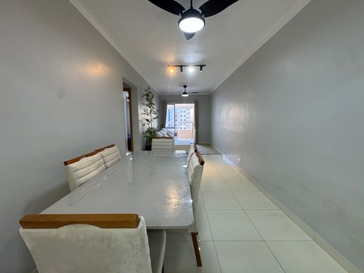A sala ampla integra-se à sacada, proporcionando um ambiente perfeito para momentos de descanso e convivência, com excelente iluminação e brisa do mar. A cozinha espaçosa é funcional e bem distribuída, acompanhada de uma área de serviço ampla, ideal para o dia a dia.