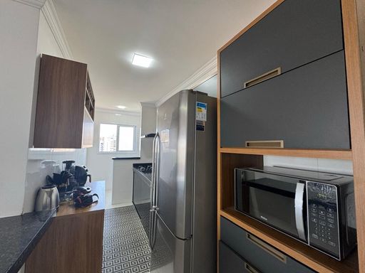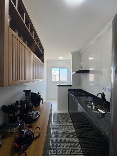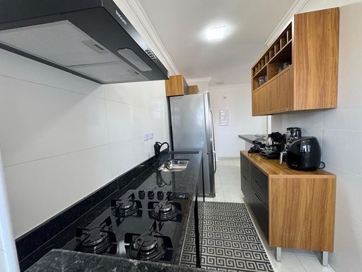 A cozinha americana conta com móveis planejados, trazendo funcionalidade e ótimo aproveitamento do espaço, além de área de serviço bem ventilada. O banheiro social possui box em vidro Blindex, garantindo conforto e um acabamento moderno.